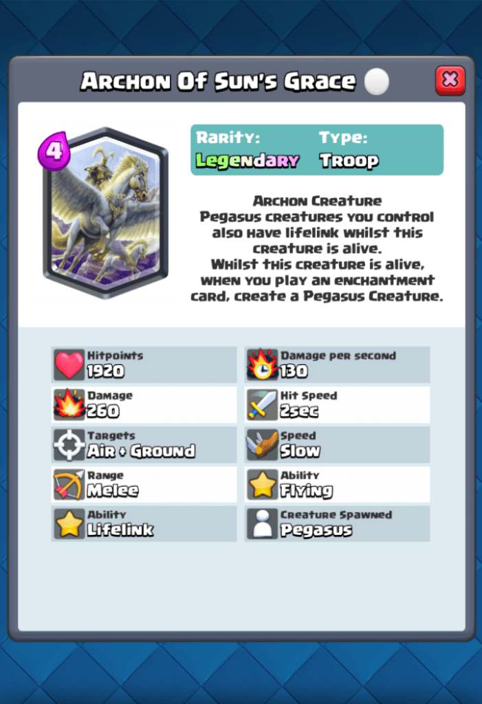 Because in both Clash Royale and Magic the Gathering, every card is given a rarity, I will also be assigning every card a rarity. I will stick quite closely to the Clash Royale Rarity system, because in clash royale, a cards Rarity tends to be an indicator of how advanced or complex a cards abilities are, however in MTG, stronger cards have higher Rarities, and it is going to be my goal to make sure that most cards are relatively balanced. Also I’m using a Clash Royale card creator to make these cards, so it’s just much more convenient. Whilst often the Magic The Gatherings’s given rarity of a card tends to be a good indicator of how rare that card should be in Clash Royale terms, it won’t be as simple as saying common = common, uncommon = rare, rare = epic, and mythic = legendary. I’m going to go off the following system to determine how rare a card should be.